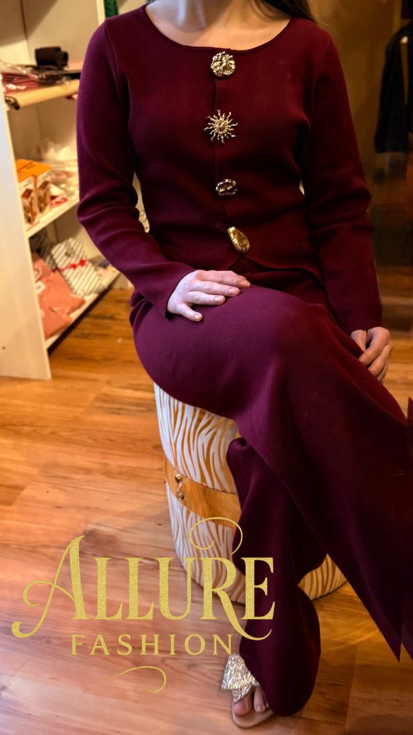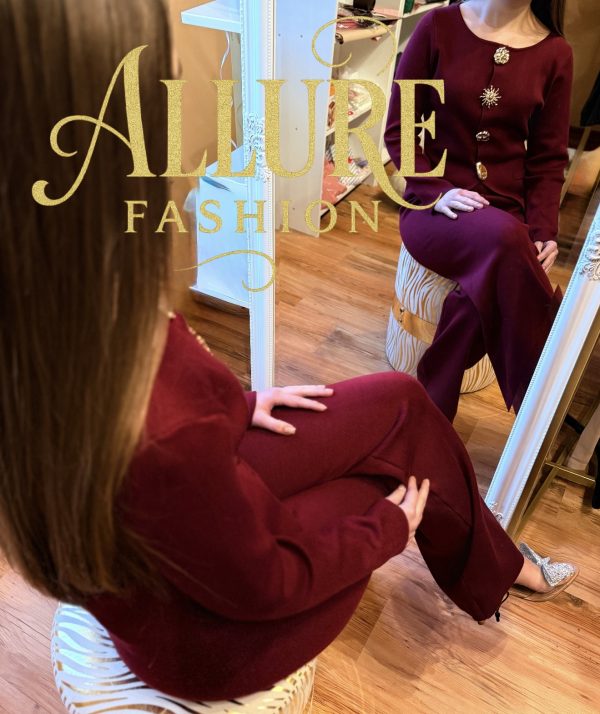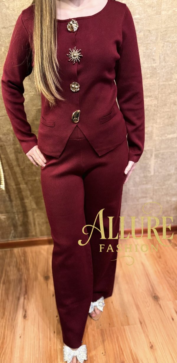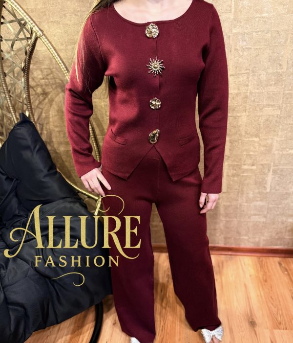 Elegantni komplet v bordo barvi z zlatimi gumbi.